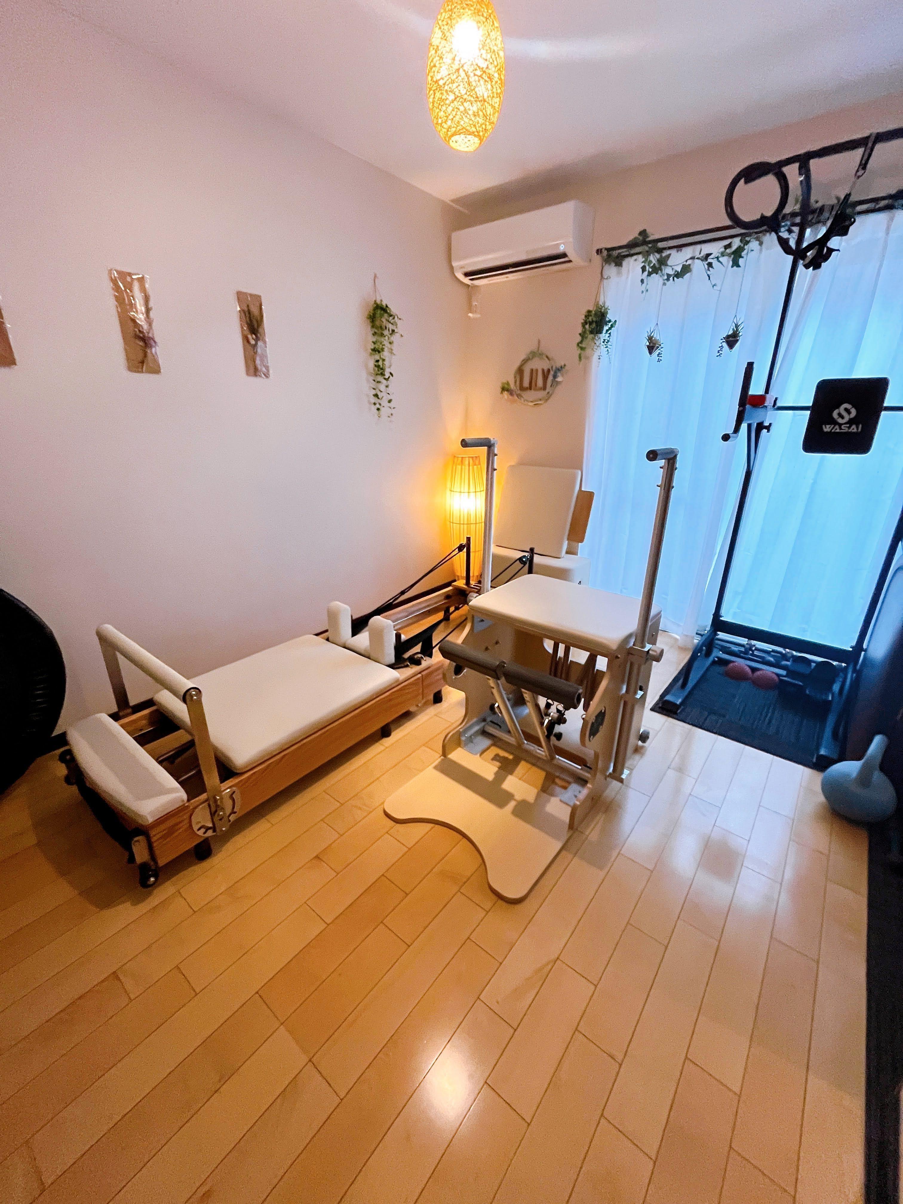 8畳の空間に、折り畳みリフォーマー・チェアなど専用マシンを完備。